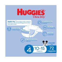 With tailor-made absorbency for boys and girls, and Huggies unique DryTouch layer which instantly absorbs wetness and springs back dry in seconds. The Breathe Dry Cover allows air to circulate around babys bum, helping keep their skin drier and is clinically proven to help prevent nappy rash. With up to 12 hours leakage protection, you and bub can sleep through the night. Tailor-made absorbency perfectly suited for baby girls. Targeted absorbency lower down where girls need it most. Soft, stretchy, comfy fit - the stretchy waistband with large grip tabs provide a soft and secure fit just like a hug. The soft cushioned leg elastics help prevent red marks on babys delicate skin.