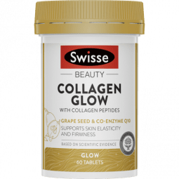 Swisse Beauty Collagen Glow with Collagen Peptides is a premium quality formula to support collagen production, skin elasticity and firmness. This beauty supplement is specially formulated with:- Collagen peptides from type I and III collagen - collagen is a major protein found in connective tissues and important for the skin's matrix. - Vitamin C to support collagen formation, skin repair and skin elasticity. - Grape seed, co-enzyme Q10 and vitamin E to provide antioxidant support and help reduce free radical damage to body cells.