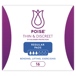 POISE Thin & Discreet Regular Pads have been specifically designed for bladder leaks, with the superior 3-in-1 dryness, comfort and odour control which a period pad cant provide! Poise Thin & Discreet Regular pads are 45% thinner than Poise regular pads and 3x drier than daytime ultrathin period pads. Superior 3-in-1 dryness, comfort and odour control which a period pad can't provideIncredibly Thin & Dry -UltraLite5 layerabsorbent core is 45% thinner than Extra Plus POISE Pads, youll barely know its thereRapidDry cover is 3x drier than leading daytime Ultrathin period padsABSORB-LOC Core instantly and continuouslyneutralisesodoursUltimate Protection - Leak-Block side shields for outstanding protectionAll day comfort - Thin-Flex core designed to holditsshape all day without scrunching, bunching, twisting or curlingLeak-Block side shields for outstanding protection. Individually wrapped - hygienic & discreet