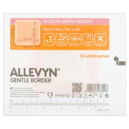 The ALLEVYN Gentle Border 10cm x 10cm is an advanced wound care solution designed to support the natural healing process. This self-adhesive foam dressing combines a highly absorbent hydrocellular foam core with a gentle silicone gel adhesive, ensuring minimal pain and trauma during dressing changes. The breathable, showerproof top film provides a bacterial barrier while maintaining a moist wound environment. The dressing is suitable for a variety of wound types, including pressure ulcers, leg ulcers, and surgical wounds. It can be cut to size without compromising its integrity, making it ideal for difficult-to-dress areas like elbows and knees. Clinical studies have shown significant reductions in wound area and depth, as well as exudate levels, when using ALLEVYN Gentle Border dressings.